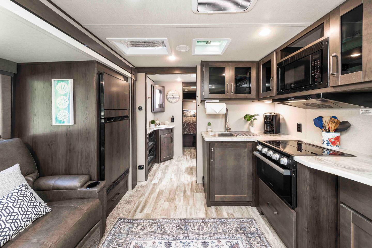 Experience the best of both worlds - close to town center, yet in a secluded and family friendly location. Enjoy an evening fire under the stars or enjoy fresh seafood just down the road. Gulf Glamper has a Livingroom kitchen combo, a pass through bathroom, and a bedroom with a full queen size bed. There is a pull out sofa that transforms into a bed. There is ample storage space through the camper for tucking away your items. The camper has three stairs that are required to enter. We have worked hard to provide everything you need to make your Gulf vacation perfect. Bedding, Linen and Bath Towels are provided. We allow two dogs under 40lbs each - there is an additional $75 pet cleaning fee per stay. The entire camper is available exclusively for your use. There is parking directly in front of the camper. You can use Uber, Bike or your personal car to enjoy the Gulf Shores area.